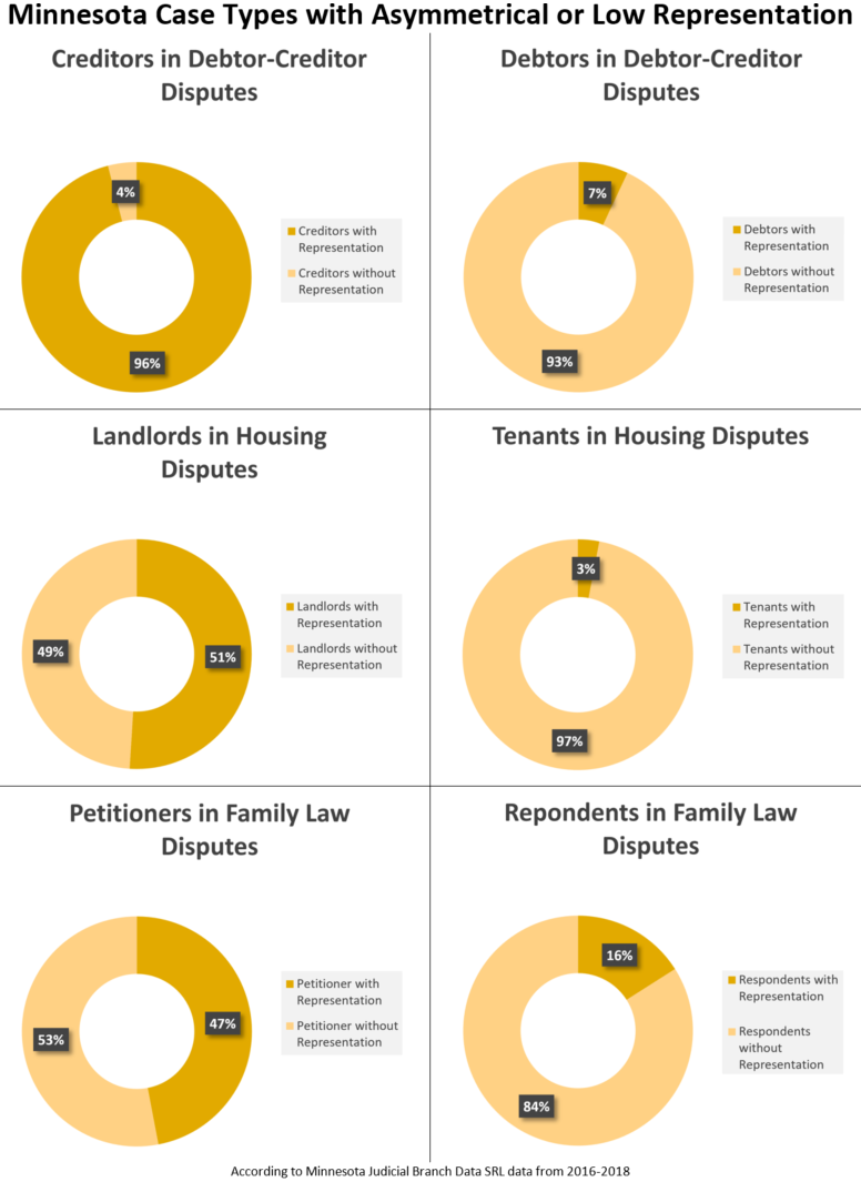 The scope of the Legal Paraprofessional Pilot Project will be limited to one of three areas of unmet need in civil law—housing disputes, family law, and creditor-debtor disputes. These three civil case types have a high frequency of asymmetrical representation or low overall representation. Minnesota courts data shows that in creditor-debtor cases 96 percent of creditors have representation and seven percent of debtors have representation. Housing disputes see similarly unbalanced but also low rates of representation with 51 percent of landlords represented and three percent of tenants represented. In family law cases, the majority of parties are unrepresented.