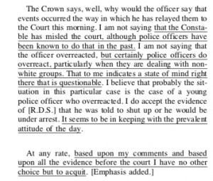 Justice Major wrote that the judge’s statement “was stereotyping all police officers as liars and racists, and applied this stereotype to the police officer in the present case… Whether racism exists in our society is not the issue. The issue is whether there was evidence before the court upon which to base a finding that this particular police officer’s actions were motivated by racism. There was no evidence of this presented at trial.”
